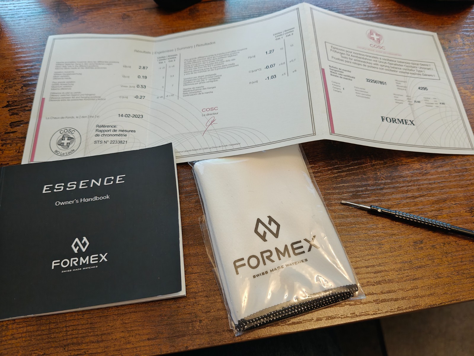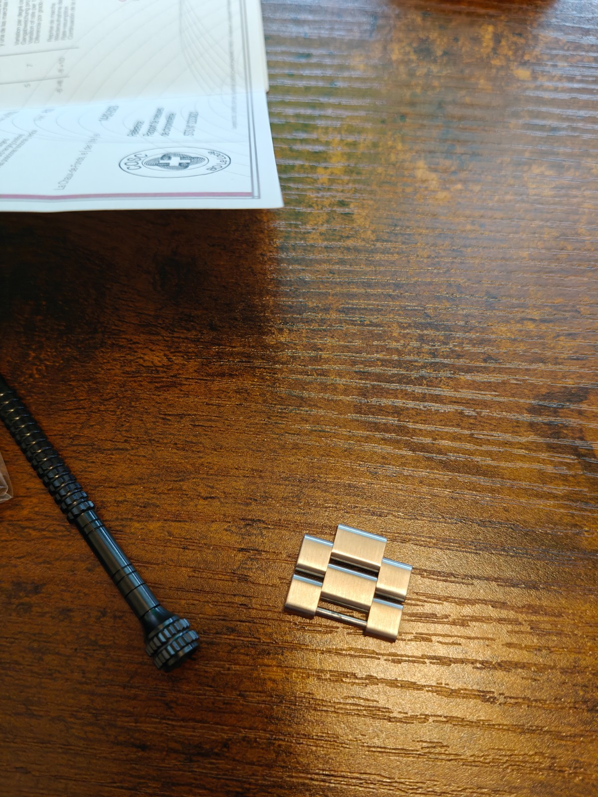 Comes with box, warranty docs, CSOC certificate, spare links, Formex cloth and bracelet screwdriver.